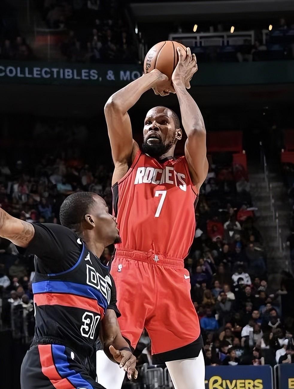 杜兰特本场火力全开,出战近41分钟,19投11中,砍下32分7篮板的数据,火箭拉开分差,面对活塞的追赶时,都是杜兰特挺身而出,本场杜兰特正负值高达+18,全场第1,作用不言而喻!