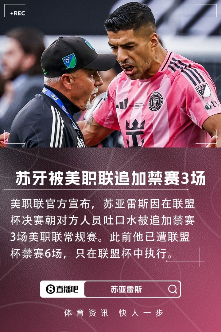 09月09日讯 美职联官方消息,苏亚雷斯因在联盟杯决赛朝对方人员吐口水被停赛3场美职联常规赛,布斯克茨未追加停赛。联盟杯决赛迈阿密国际0-3不敌西雅图海湾人,赛后双方发生冲突,苏亚雷斯向对方工作人员吐口水,布斯克茨则向对方中场巴尔加斯挥拳。美职联就联赛杯决赛后事件公布处罚决定苏亚雷斯被停赛三场MLS常规赛,将缺席9月14日(客战夏洛特FC)、9月17日(主场...