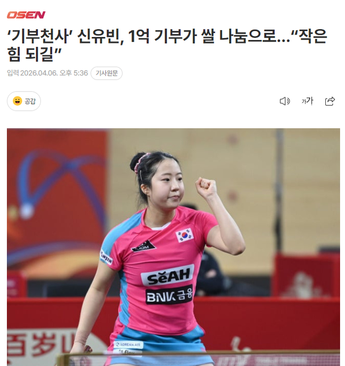 北京时间4月6日,根据韩媒《OSEN》的报道,申裕斌化身‘捐赠天使’,她向忠清南道唐津市捐赠了1亿韩元,该捐款于本月3日通过唐津市往较为偏远的地区以大米的形式进行捐赠。